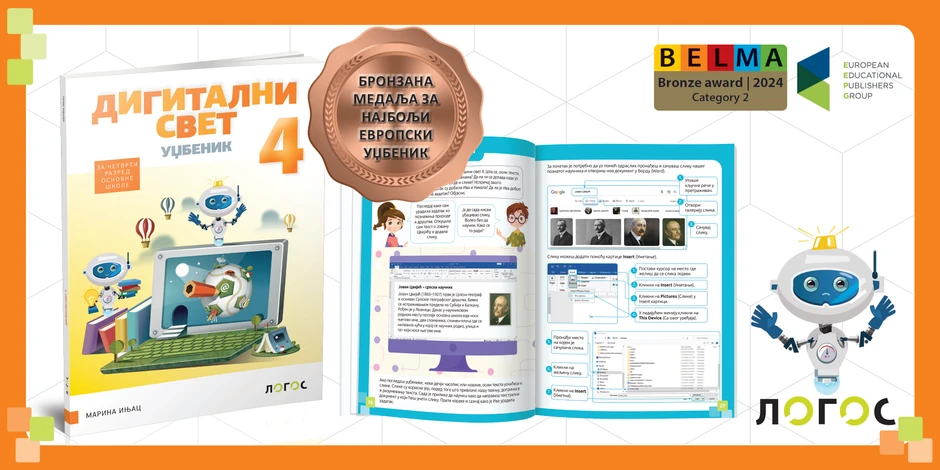 Digitalna tehnologija je već promenila svet – kako deca rastu, raste i mogućnost da ona pozitivno utiče na njihovo obrazovanje. Tome najbolje svedoči i činjenica da je, u konkurenciji od 27 izdavača iz 13 zemalja, udžbenik Digitalni svet za četvrti razred osnovne škole Izdavačke kuće „Novi Logos“, autorke Marine Injac nagrađen bronzanom medaljom za najbolji evropski udžbenik (BELMA) na Frankfurtskom sajmu knjiga.