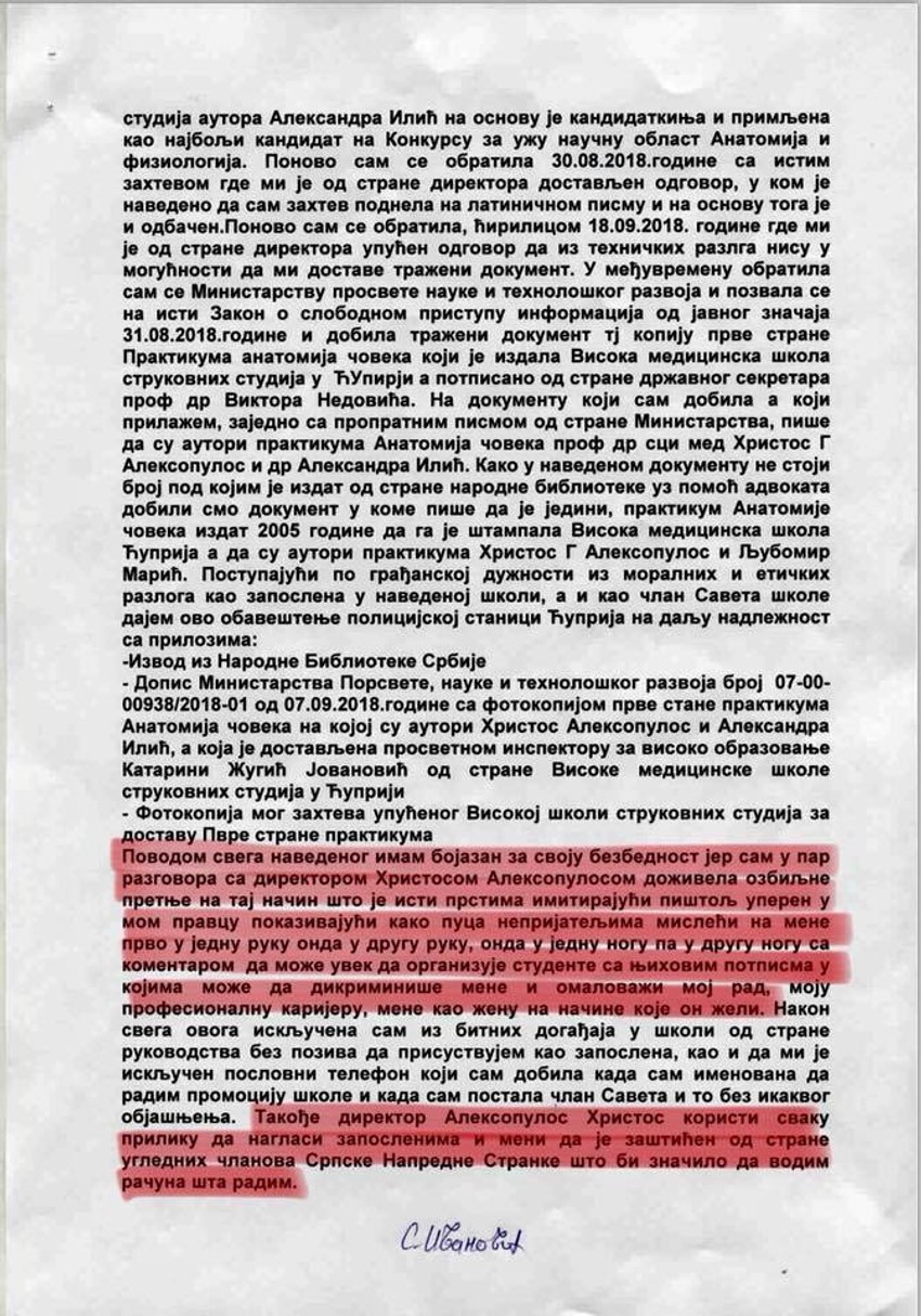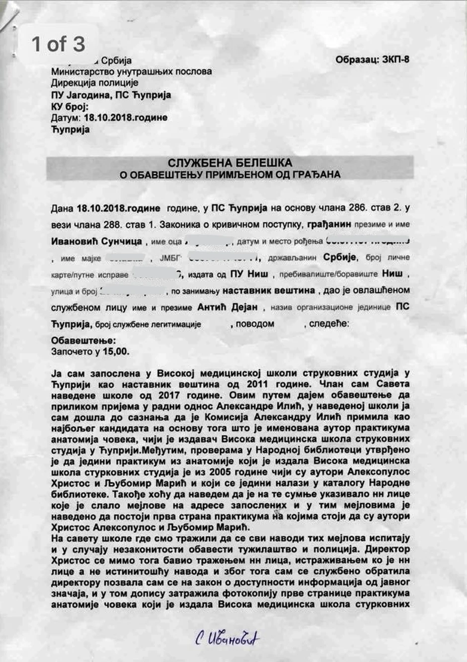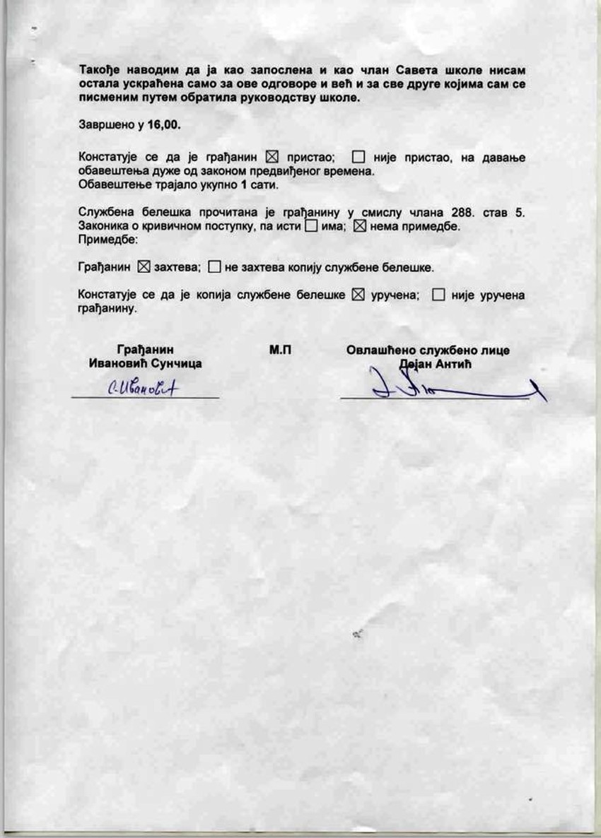 (Dokument iz nastavka teksta je službena beleška koju je sačinio MUP na osnovu izjave profesorke Sunčice Ivanović)