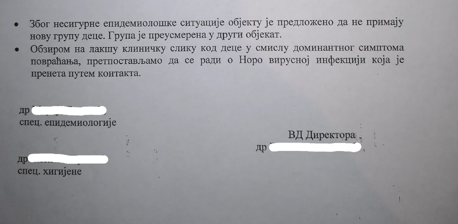 Deca su povraćala, imala dijareju, visoku temperaturu, jeli su nedovoljno kuvana jaja i viršle. Utvrđeno je da su usled nehigijendskih uslova u kojima su boravili imali infekciju Noro virusom koji se širi putem kontakta.