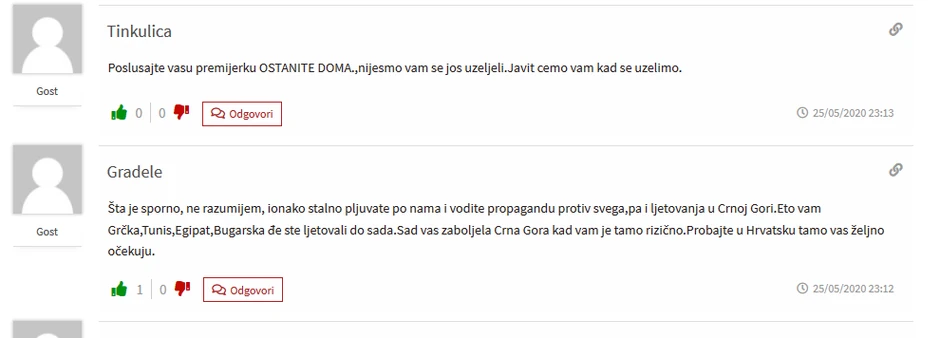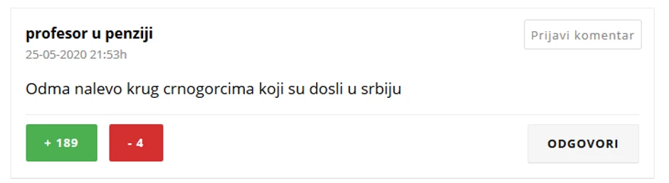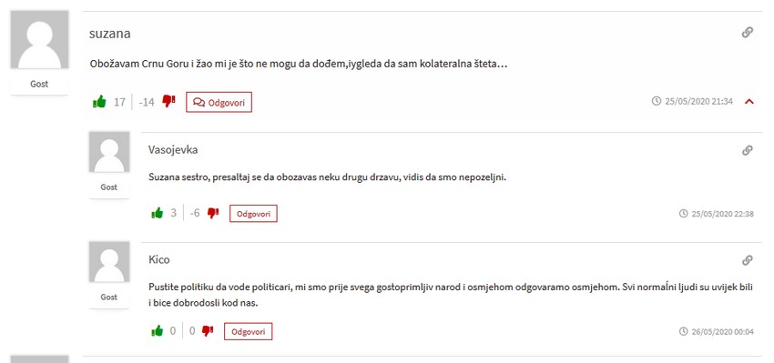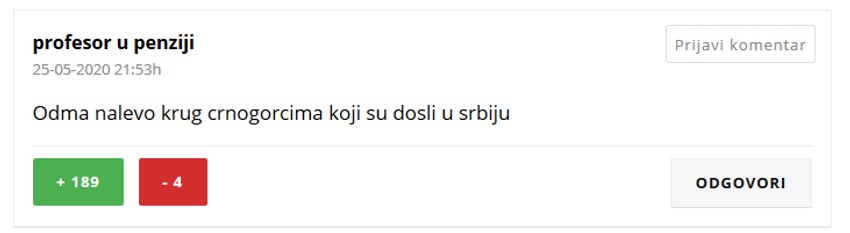 „Mi treba njima da zatvorimo granice čim počnu predavanja na fakultetima“, „Nalevo krug Crnogorcima koji su došli u Srbiju“ ili „Bravo!!! Tako je i šta će Srbi tamo. Oni imaju svoju braću Albance i Hrvate! Taman su se lepo našli. Svaka krpa nađe zakrpu“ samo su neke od poruka koje su komentatori sa srpskih portala upućivali do juče bratskom narodu.