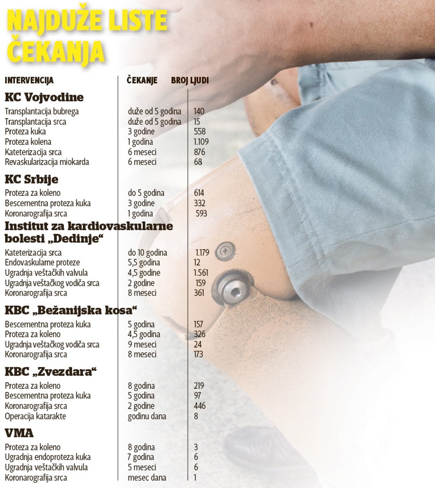 U Kliničkom centru Srbije, gde se leče pacijenti iz cele zemlje, na operaciju kolena i katarakte se čeka i do pet godina, dok na koronarografiju srca (pregled pomoću kojeg se dijagnostikuje zakrčenje krvnih sudova) neki pacijenti čekaju i do godinu dana.