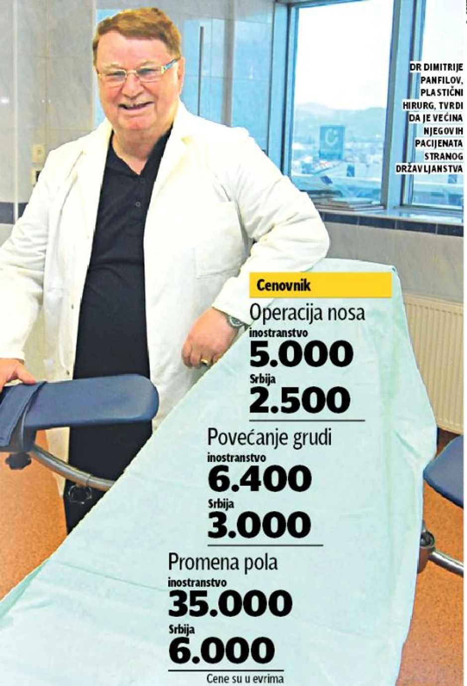 - U samo poslednje dve nedelje imao sam pacijente iz Melburna, Tokija, dvoje iz Holandije i dvoje iz Skandinavskog poluostrva. Procenat stranih pacijenata stalno raste, u prva tri meseca ove godine imali smo ih duplo više nego u isto vreme prošle godine. Na mojoj klinici u Bonu u Nemačkoj operacija nosa je 5.000 evra, a u novosadskoj klinici košta 2.500 evra. Povećanje grudi u Nemačkoj je 6.400 evra, slična cena je i za povećanje penisa, a kod nas te operacije koštaju 3.000 evra - rekao je Panfilov.