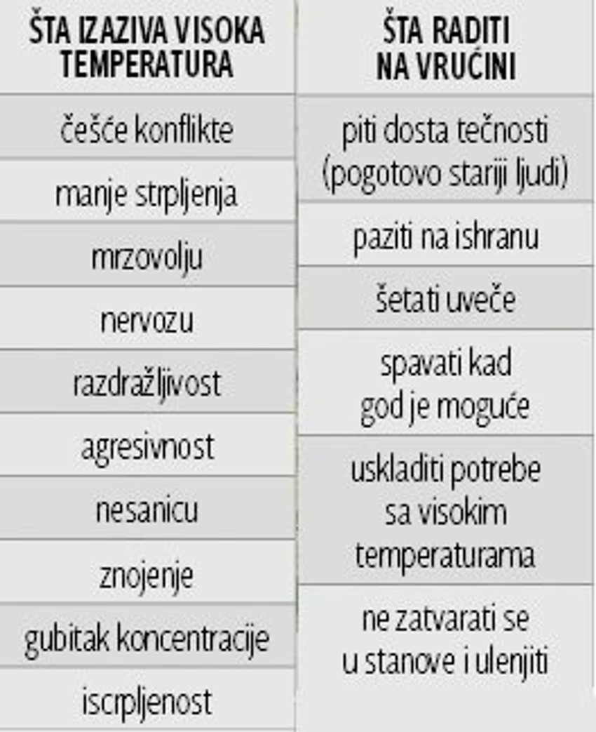 Dr Nevenka Dimitrijević iz Doma zdravlja Voždovac kaže da visoke temperature utiču na nesanicu, smanjenu volju, zamorljivost, iscrpljenost te motivaciju u smislu da nam teže padaju obaveze na poslu i da nam treba više energije da se pokrenemo.