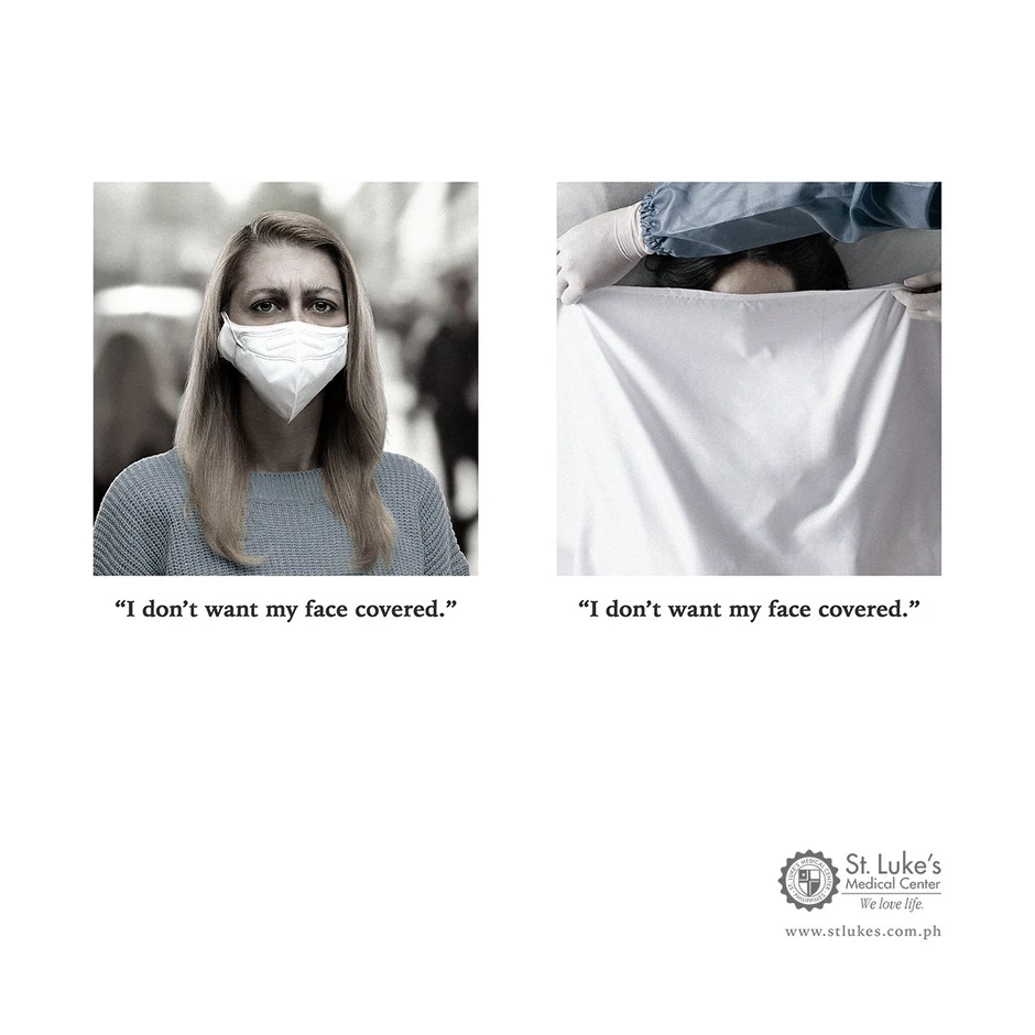 Na poslednje dve fotografije prikazana je i najdramatičnija poruka. Naime, na prvoj fotografiji osoba odbija da nosi masku jer joj smeta kada joj tkanina prekriva lice, dok je na fotografiji prikazana osoba koja je premenilu od posledica korone i belim čaršafom joj se prekriva lice.