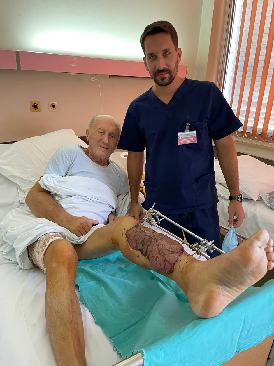- Kao kod Dejana koga smo operisali neki mesec ranije, odlučili smo da uzmemo široki leđni mišić na vaskularnoj peteljci čiju smo arteriju i venu pod mikroskopom ušili na jednu od tri magistralne arterije potkolenice i njenu venu. Obzrom na veličinu defekta, to nam nije bilo dovoljno da zatvorimo ranu, pa smo još dva mišića sa zadnje strane potkolenice prebacili na njihovim vaskularnim peteljkama i time pokrili sve ekponirane koštane i tetivne strukture - objašnjava dr Radivojčević, i dodaje da je nakon toga, na mišiće urađena transplatacija kože.