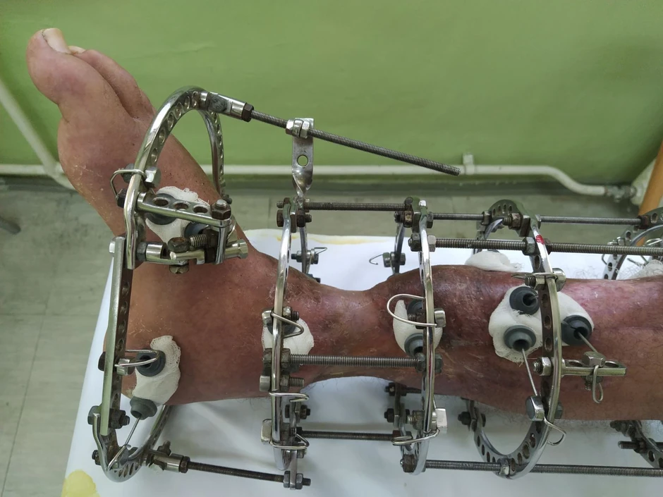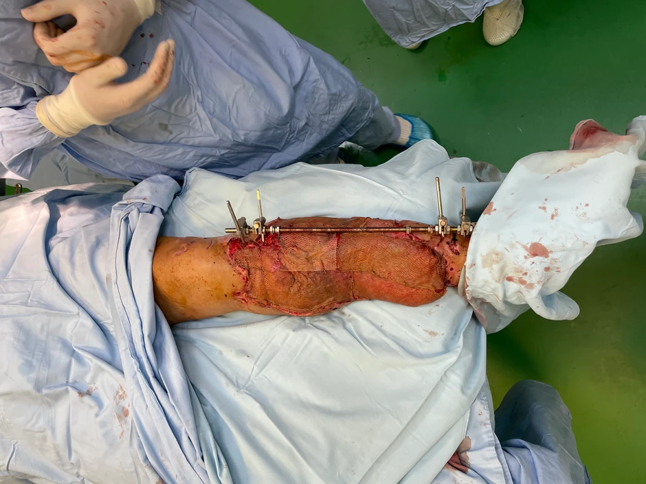 Po prijemu na ovu kliniku, lekari konstatuju da je došlo do nekroze mekotkivnog pokrivača i da nakon hirurške obrade rane zaostaje gotovo u celosti eksponirana kost prednje strane potkolenice i eksponiranim tetivama.