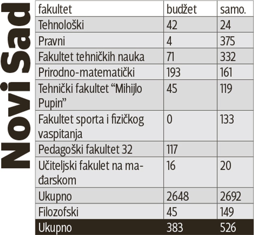 Na Univerzitetu u Novom Sadu upis traje do 21. jula, te nisu svi fakulteti objavili broj preostalih mesta. Kada se oni izuzmu, najviše mesta ostalo je na Fakultetu tehničkih nauka, čak 403, dok je najviše budžetskih mesta na PMF-u - 193.