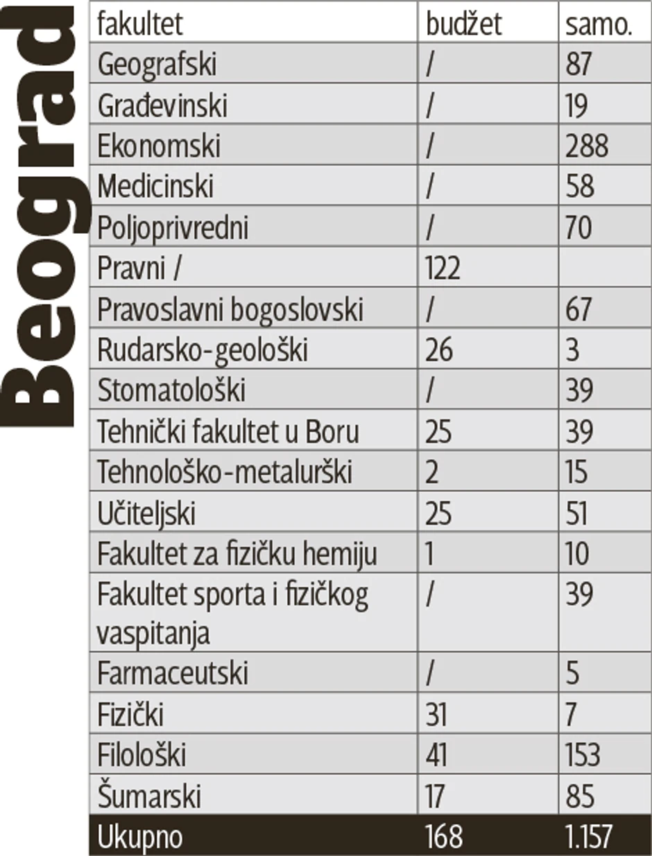 Prema podacima Univerziteta u Beogradu, koji je raspisao konkurs za prijem 15.235 brucoša, za upis u drugom krugu ostalo je samo 1.325 mesta - 168 na budžetu i 1.157 samofinansirajućih. Kvote su već popunili Arhitektonski, Biološki, Elektrotehnički, Matematički, Mašinski, Saobraćajni, Fakultet bezbednosti, Fakultet veterinarske medicine, FASPER, Fakultet organizacionih nauka, Fakultet političkih nauka, Hemijski i Filozofski fakultet. Za one kojima je bitno da u drugom krugu upadnu na budžet, najviše ovakvih mesta na raspolaganju je na Fizičkom fakultetu (31), dok će najveći broj njih samofinasirajuće studije moći da upiše na Ekonomskom (288).