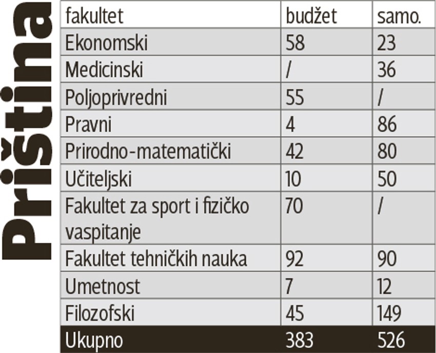 S druge strane, na Univerzitetu u Prištini, koji je izmešten u Kosovsku Mitrovicu, upisano je 849 studenata, dok je za upis u drugom krugu ostalo čak 909 mesta, od čega 383 na budžetu. Prema podacima sa tog Univerziteta, najviše slobodnih mesta ostalo je na Filozofskom fakultetu, gde je spremno još 194 indeksa, a nešto manje, 182, na raspolaganju je na Fakultetu tehničkih nauka. Na radost studenata, svi fakulteti ovog univerziteta, osim Medicinskog, u drugom krugu nude i mesta koja finansira država.
