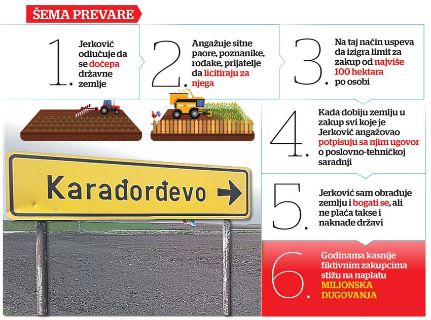Ipak, Jerković je uspeo da godinama, od 2007, nesmetano, mimo zakona, zakupljuje državne oranice i bogati se, dok sada njegovim žrtvama, sitnim paorima, stižu na naplatu milionske naknade za odvodnjavanje i zakup zemljišta.