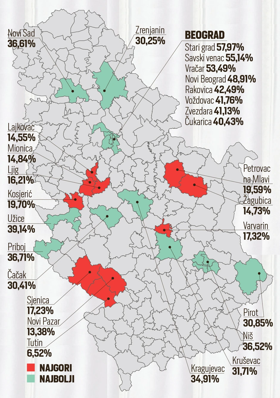 Beograd je prvi grad u Srbiji koji ima više od 40 odsto vakcinisanih punoletnih stanovnika, a iza njega sledi Užice sa 39,14 procenata imunizovanih građana, zatim Sremska Mitrovica, Priboj, Novi Sad i Niš gde je cepljeno više od trećine populacije straije od 18 godina. S druge strane, u Tutinu, Novom Pazaru, Lajkovcu, Žagubici i Mionici još nema ni 15 procenata vakcinisanih, pokazuje statistika Kancelarije za IT i E-upravu koju ekskluzivno predstavlja “Blic”. Ubedljivo najslabije stoji opština Tutin sa samo 6,5 odsto vakcinisanog odraslog stanovništva, što znači da je zaštitu primio tek svaki 15. građanin.