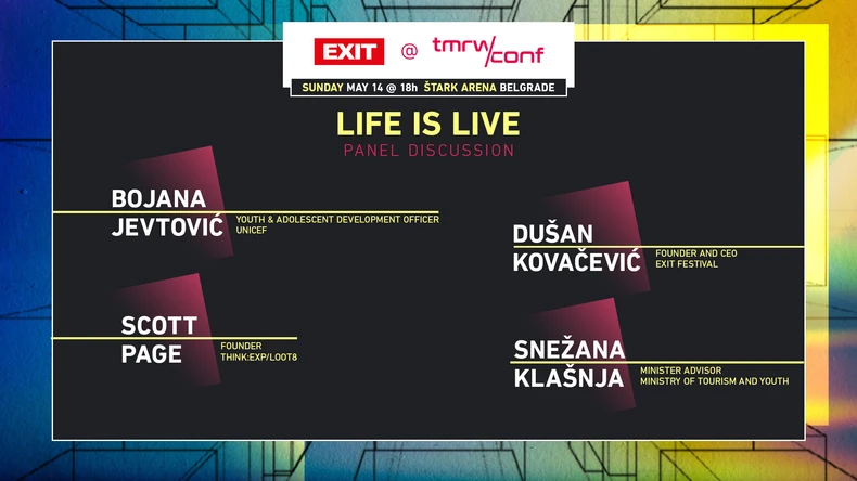 Na panelu „Life is Live” govoriće muzičar i digitalni ekspert, poznat i kao jedan od članova legendarne rock grupe Pink Floyd Scott Page, savetnica ministra turizma i omladine za omladinsku politiku Snežana Klašnja, savetnica programa za razvoj adolescenata i mladih ispred UNICEF-a Bojana Jevtović, i osnivač i direktor EXIT festivalske grupacije Dušan Kovačević.