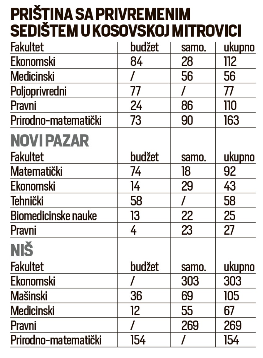 Na Univerzitetu u Prištini sa privremenim sedištem u Kosovskoj Mitrovici ostalo je ukupno 1.086 slobodnih mesta, od toga je 515 budžetskih, i 571 samofinansirajućih.