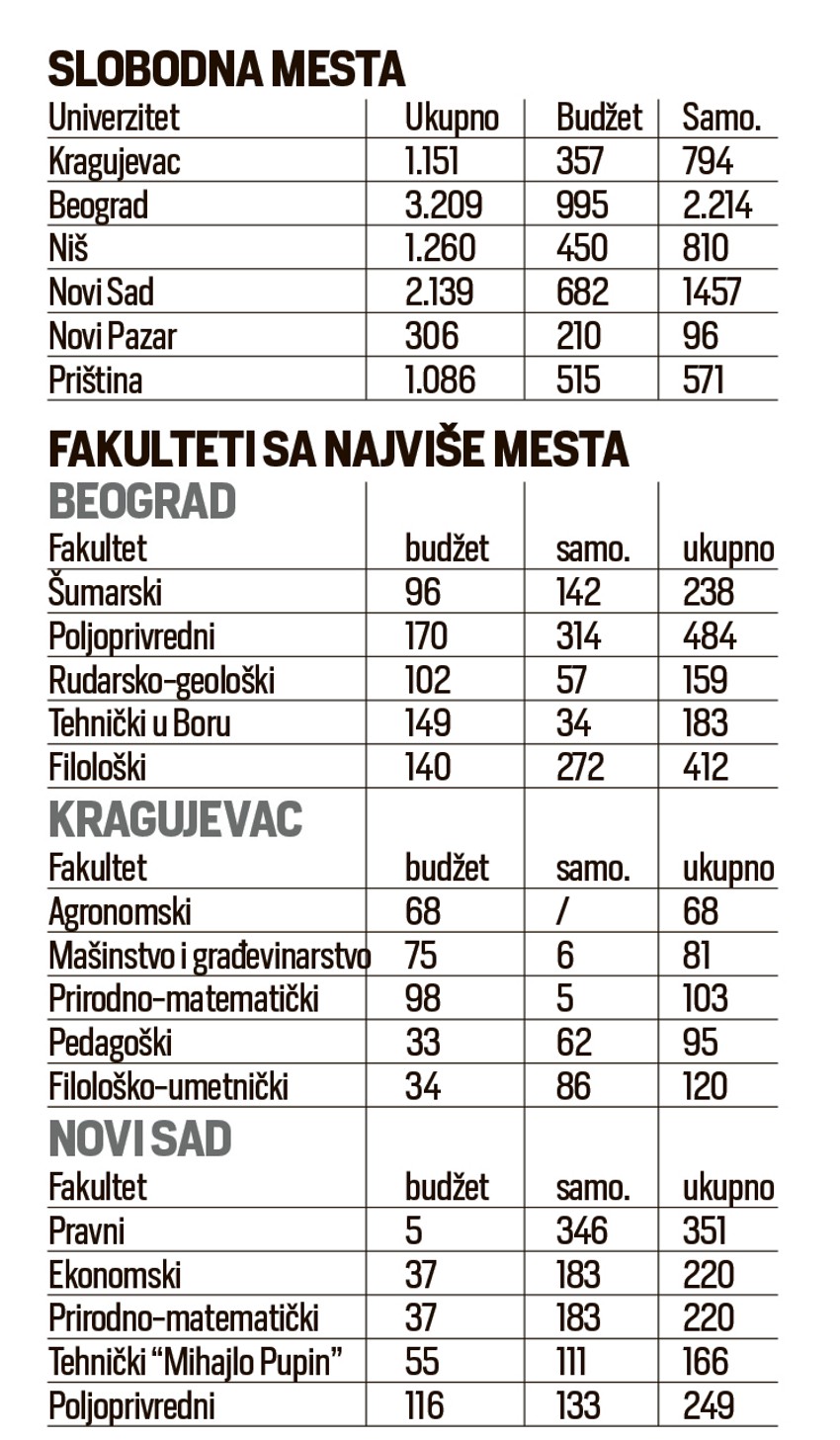 Samo u Beogradu ostalo je još 3.169 slobodnih mesta, od toga 995 na budžetu i 2.214 samofinansirajućih. Najviše mesta je na Šumarskom fakultetu, gde je od 345 ostalo nepopunjeno 238 mesta, od toga 96 budžetskih i 142 samofinansirajućih, dok je na Fizičkom fakultetu od 155 mesta, 96 nepopunjeno.