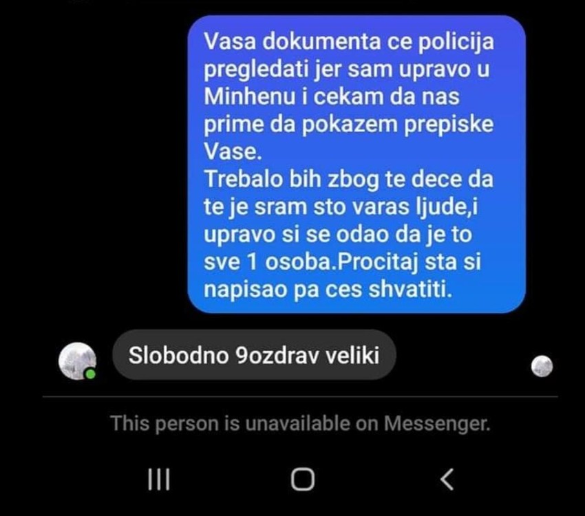 - Imam sve papire i, računala sam da je to neka taksa 20-30 evra, kad čovek traži 285 evra za taksu. Napravila sam se kao da nemam pare i, naravno, da nikad nisam dobila adresu restorana, niti broj telefona Damira, odnosno Suadovog zemljaka, izmišljenog u njegovoj glavi. Jako je teško vreme, ljudi trče trbuhom za kruhom, a ovaj neka mesečno na ovu foru odradi petoro ljudi, dobar je 1.500 evra - kaže ona i dodaje da je ovo postavila na još jednoj grupi i da su joj se javljali ljudi kojima je isti muškarac nudio stanove u Minhenu. Tražio je da mu uplate 200 evra kako bi došao da im izda stan.