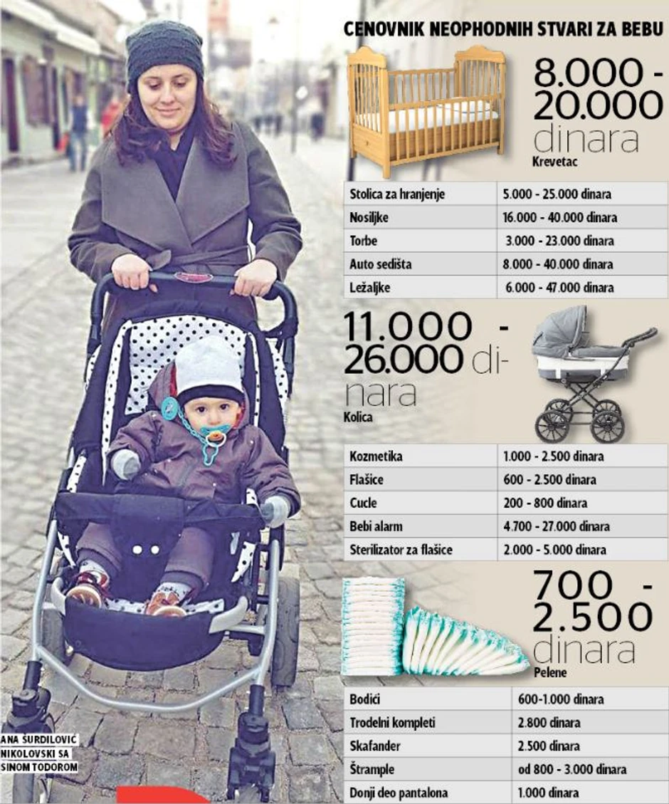 Tako se krevetac u prodavnicama u Srbiji možete kupiti za najmanje 8.000 dinara, dok su skuplje varijante od 20.000 dinara i više, za dušek je neophodno izdvojiti minimum 10.000 dinara. Cene nosiljki kreću se između 10.000 i 40.000 dinara, ležaljke od 6.000, a suma ide i do 48.000 dinara. Kada mamama ponestane mleka za bebe, moraće da se opskrbe s onim u prahu, a kutija staje od 500 do 1.800 dinara. Veliki je raspon cena i pelena od 700 do 2.000 dinara, dok flašice staju od 600 do 2.500 dinara. Za kolica roditelji moraju da izdvoje od 10.000 do 126.000 dinara. Ne treba zaboraviti ni na kreme i kupke za dečju kožu za koje roditelji izdvajaju između 1.000 i 2.500 dinara, u zavisnosti da li je bebi potrebna bolja nega. Mlade mame, sagovornice "Blica", savetuju da je najvažnija dobra organizacija, ali da je od velikog značaja pozajmljivanje ili nasleđivanje opreme za bebu.