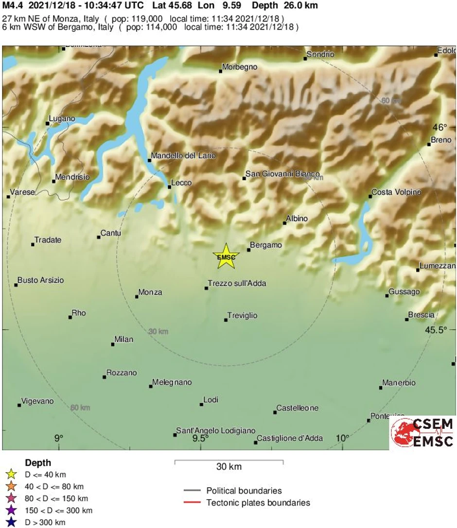 Dubina je utvrđena na oko 30 kilometara. Zemljotres se osetio širom Lombardije.