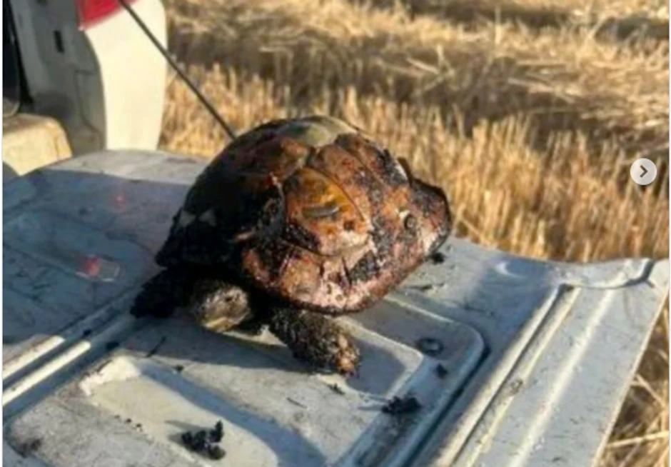 Na fotografijama koje je na društvenim mrežama objavio MUP, vidi se mala šumska kornjača okružena plamenom, a koju su nedavno spasli vatrogasaci iz Aleksinca, pruživši joj adekvatnu pomoć.