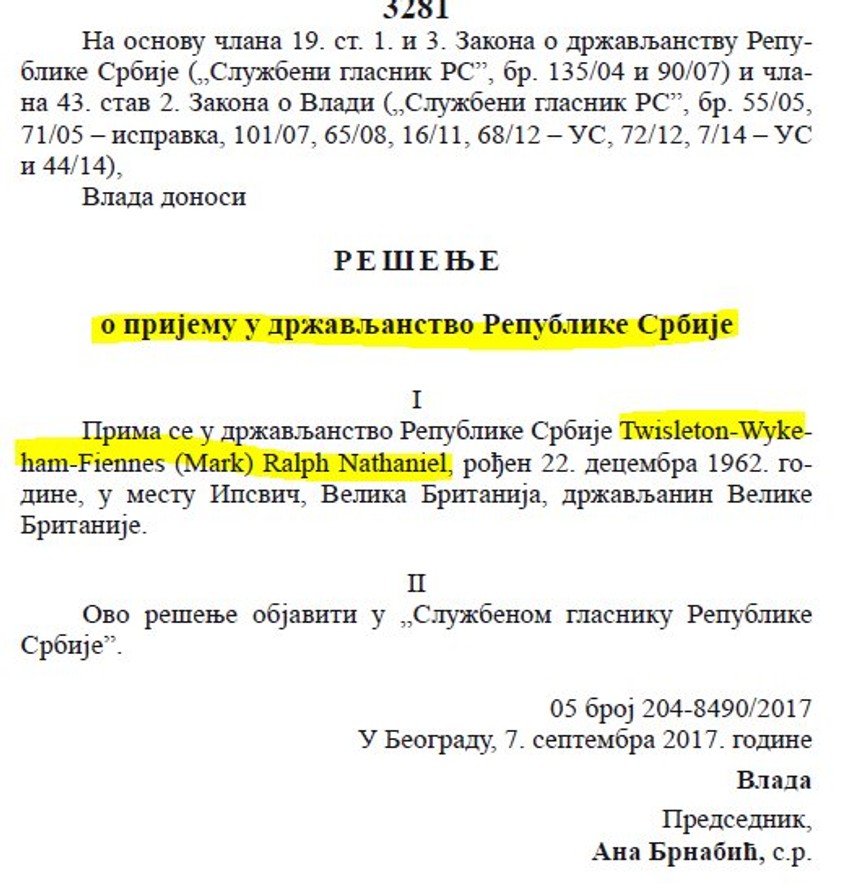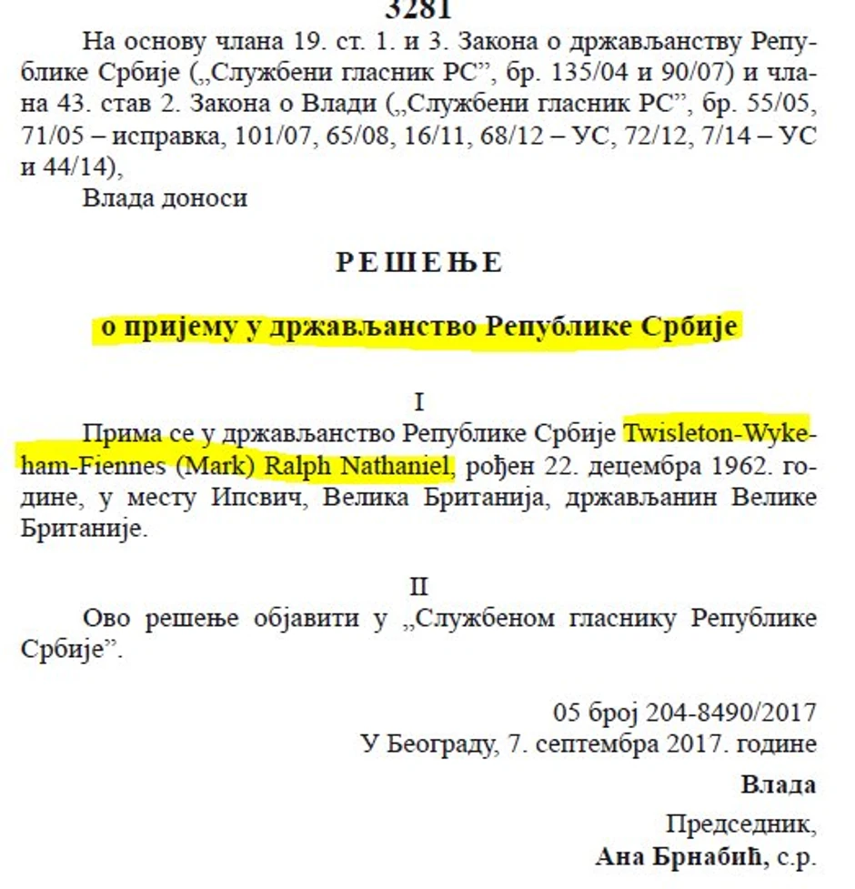 Britanski glumac i reditelj Rejf Fajns dobio je državljanstvo Srbije, objavljeno je u poslednjem "Službenom glasniku".