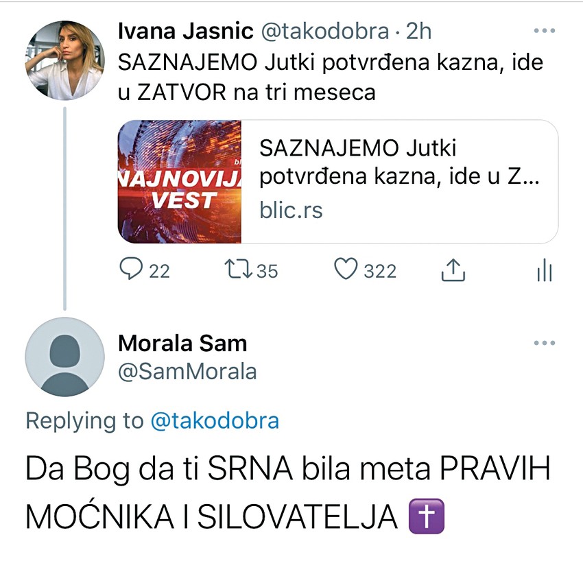Novinarka koja je otkrila priču o tome kako je Jutka seksualno uznemiravao svoju tadašnju poslovnu saradnicu Mariju Lukić i još nekoliko žena koje su ga prijavile policiji, prva je objavila i informaciju da je Viši sud u Kragujevcu potvrdio prvostepenu presudu Jutki, po kojoj on zbog seksualnog uznemiravanja mora da provede u zatvoru tri meseca. Link teksta postavila je na svom Tviter nalogu nakon čega je sa profila @MoralaSam stigla pretnja.