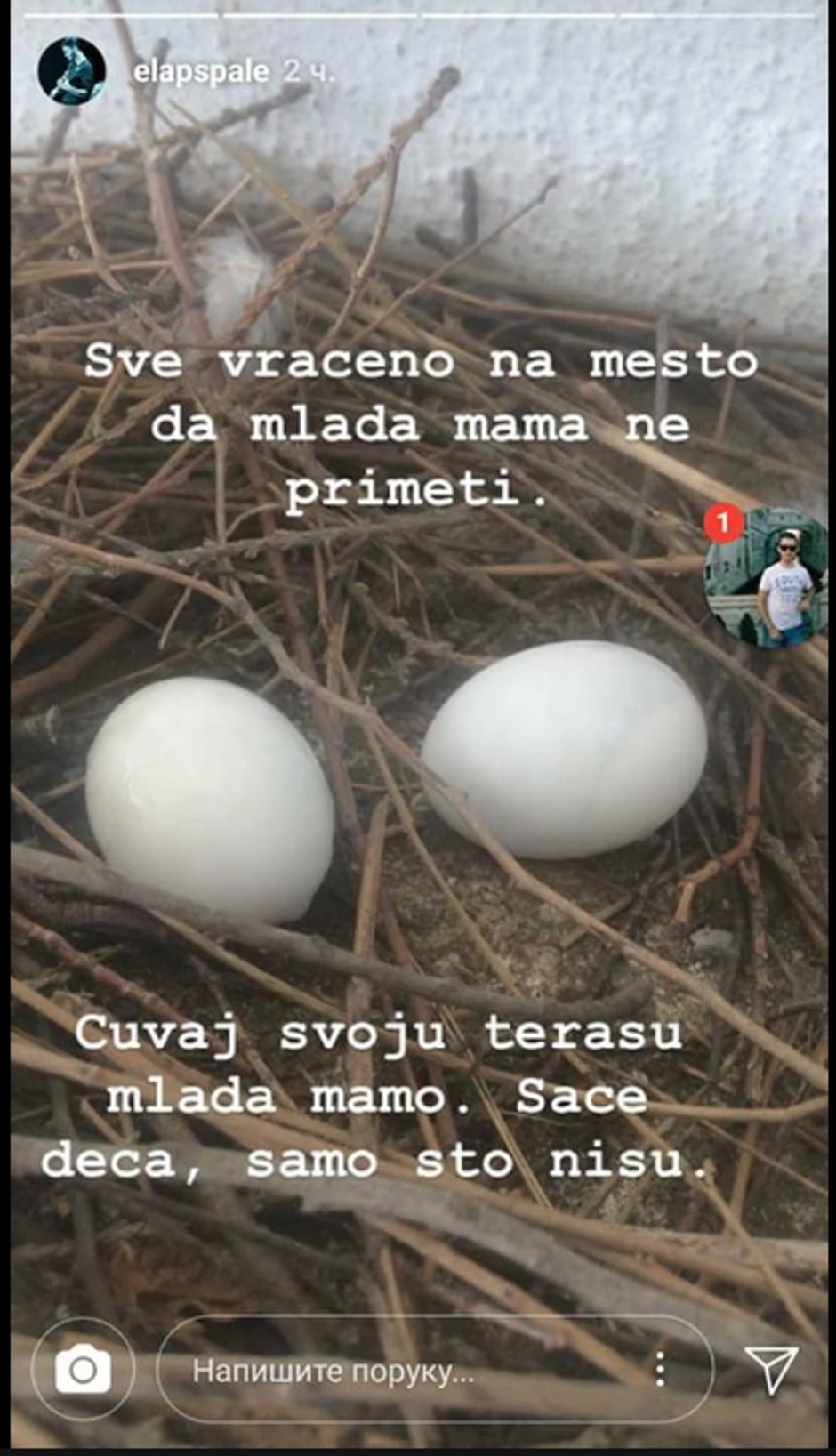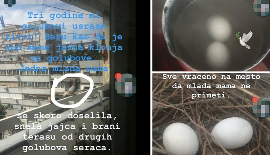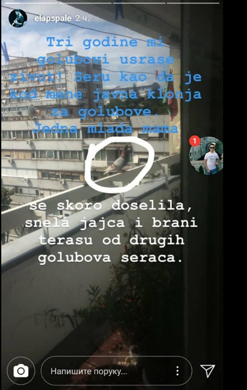 "Tri godine mi golubovi us*aše život. Se*u kao da je kod mene javna klonja za golubove. Jedna mlada mama se skoro doselila, snela jajca i brani terasu od drugih golubova se*ača", napisao je on kao propratni teskt uz fotografiju mame golubice.