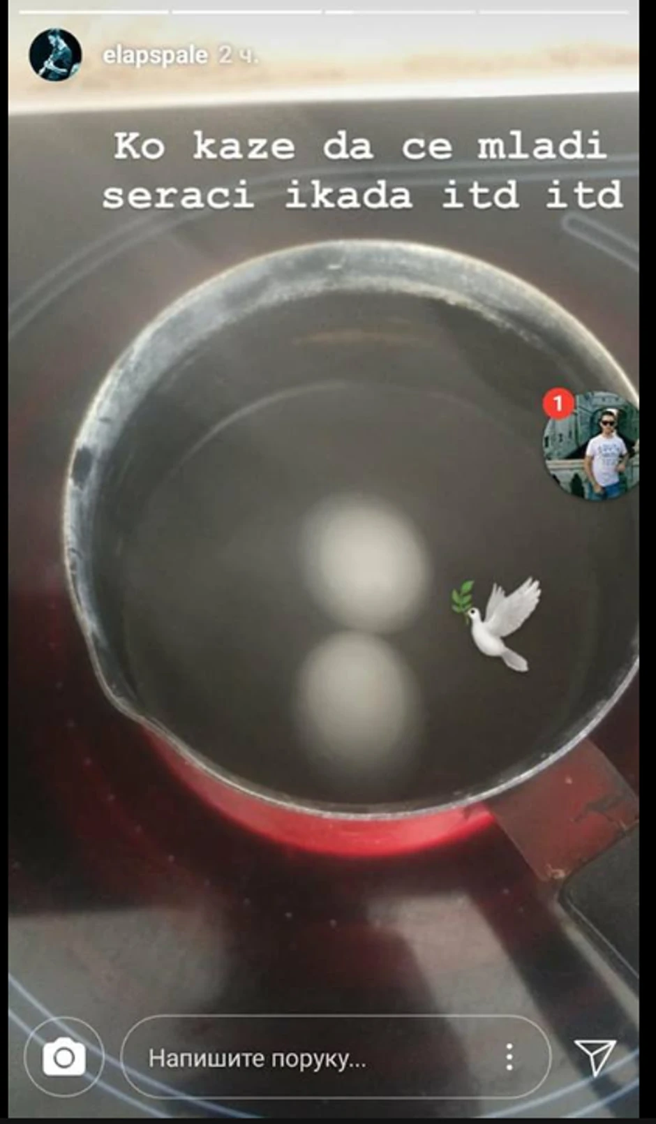 Nakon fotografije terase na kojoj se vidi gde je golubica napravila gnezdo, sledi ona koja tera suze na oči. Naime, on je uzeo golubicina jaja i napravio sliku kako ih kuva, uz komentar " ko kaže da će mladi ...".