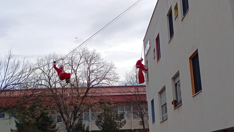 Pripadnici Gorske službe spasavanja spustili su se sa krova Klinike za pedijatriju u Nišu u odelima Deda Mraza kako bi deci u bolnici podelili novogodišnje paketiće