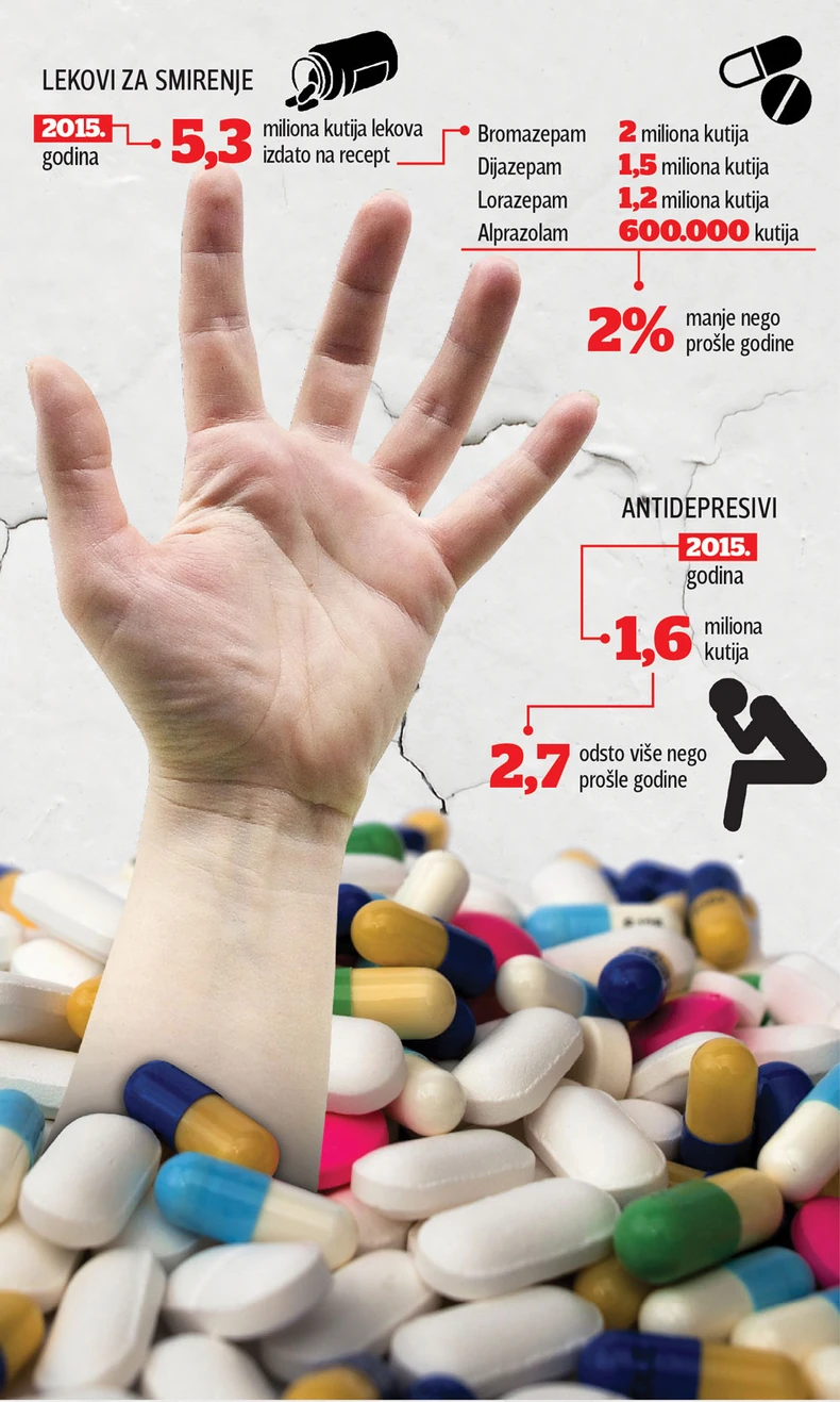 Tokom prošle godine građani Srbije popili su 5,3 miliona pakovanja lekova za smirenje ili 159 miliona tableta, što je za oko dva odsto manje u odnosu na 2014. Ipak, koliko ovih lekova zaista popijemo teško je utvrditi jer se ne zna tačno koliko ih je prodato u privatnim apotekama bez recepta.