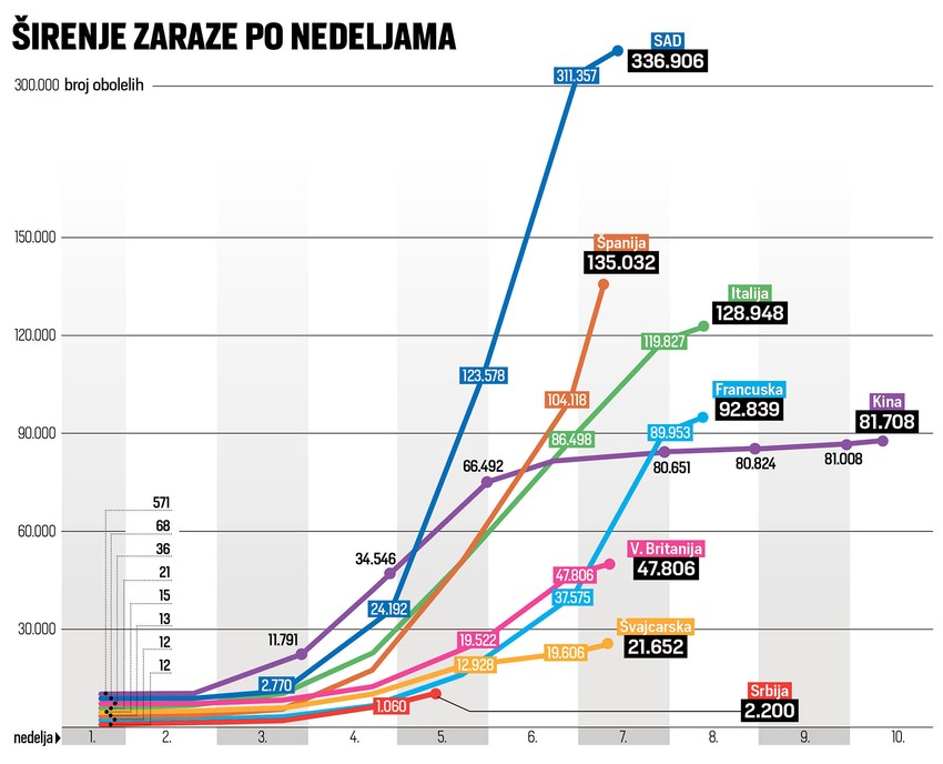 Ono što možemo nazvati dobrim u svoj ovoj nesreći jeste što se kriva novozaraženih u Srbiji za sada kreće onako kako su naši epidemiolozi priželjkivali. Bez obzira na povećanje broja zaraženih poslednjih dana, moramo biti svesni da je u mnogim drugim državama došlo do prave eksplozije broja inficiranih ljudi u nedelji epidemije u kojoj se mi sada nalazimo.