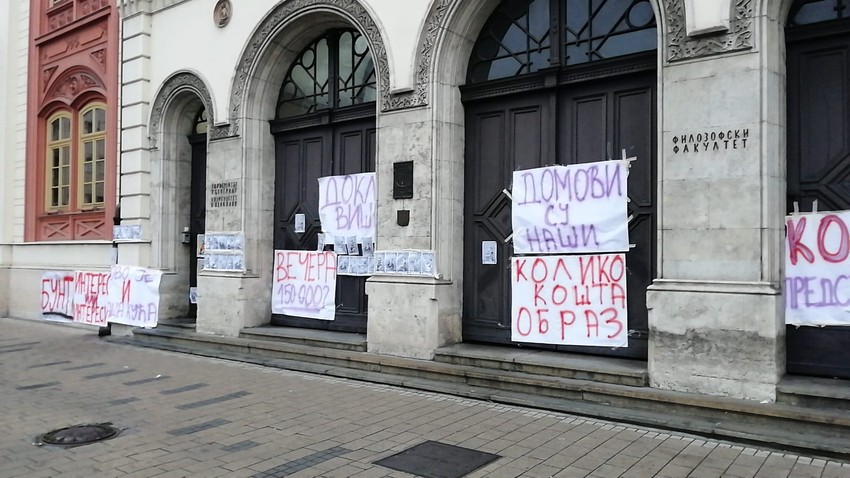 Studenti su istakli transparente "Koliko košta obraz" , "Dokle više", "Ovo je i naša kuća"...