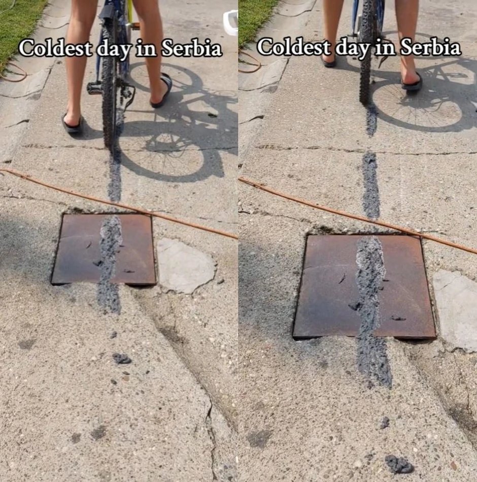 Tako je jedan Tiktoker u piku toplotnog talasa provozao bicikl po dvorištu u Prigrevici kod Apatina, a kako pokazuje u videu, kada je prešao preko poklopca od šahte, guma od bicikla je počela da se topi i ostavlja trag.