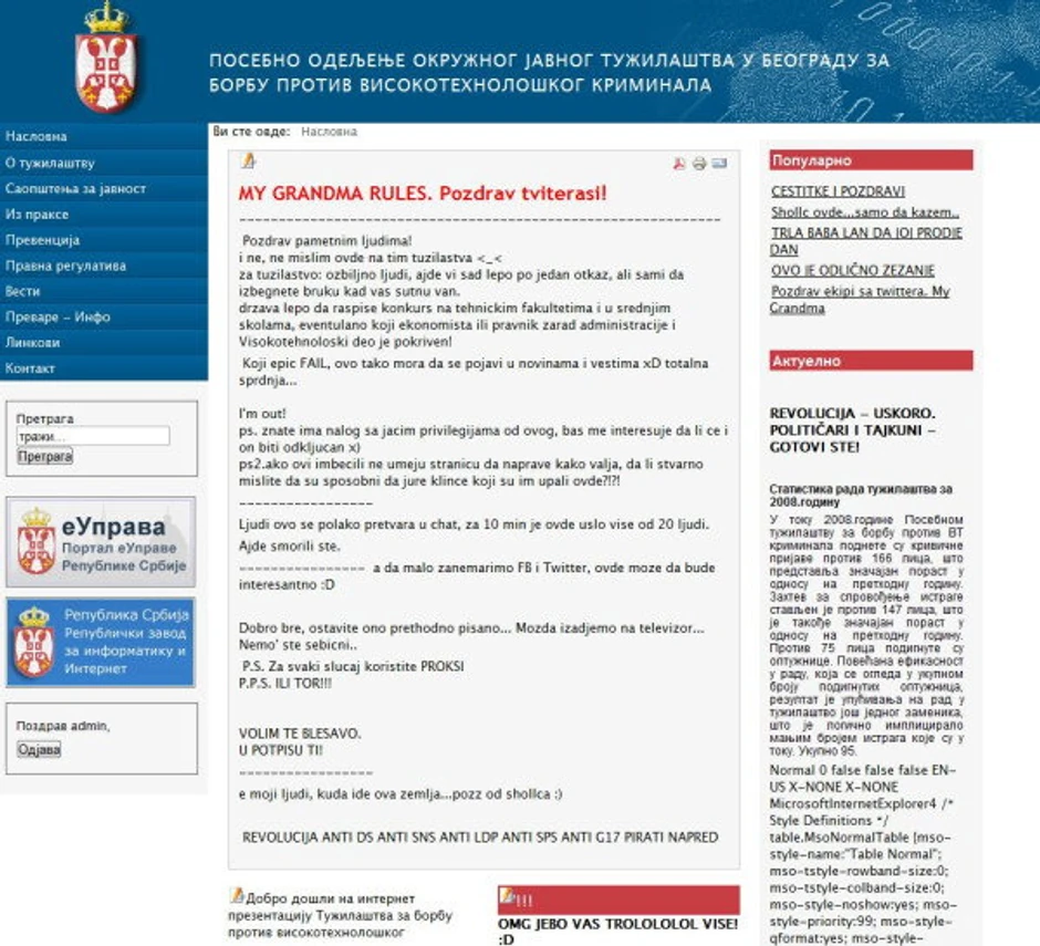 Sajt posebnog odeljenja okružnog tužilaštva koje se bavi borbom protiv visokotehnološkog kriminala sinoć je hakovan.