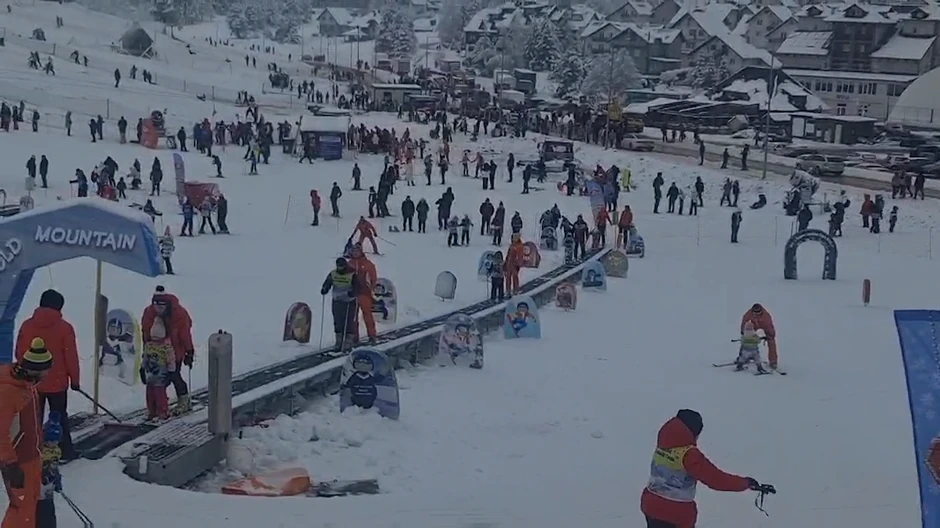 Ljudi svih generacija stoje u redovima, deca se sankaju, ski staza krcata.