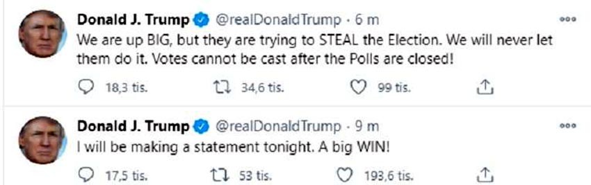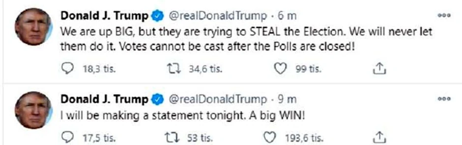 Donald Tramp se, između ostalog, samoproklamovao kao najveći borac protiv lažnih vesti, ali verovatno će ostati upamćen i kao jedan od najrelevantnijih proizvođača istih. Njegov odnos sa Tviterom biće deo političkih doktorata, a sve je doživelo vrhunac na minulim izborima kada su ga se odrekli i "Foks njuz", koji ga je otvoreno podržavao, ali je i prvi je objavio da je aktuelni predsednik SAD izgubio Arizonu i demantovao informacije da je pobedio u državama u kojima su se još brojali glasovi. Tramp se u izbornoj noći obratio naciji na Tviteru i obdnarodovao svoju pobedu. Lažnu.