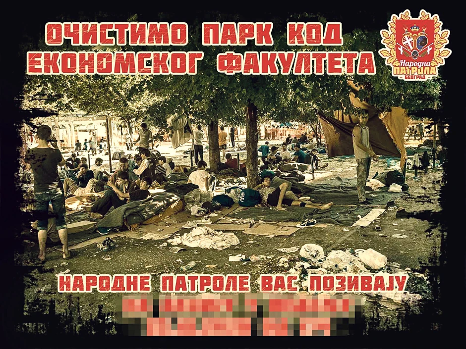 Internetom ovih dana kruži fotografija migranata sa jezivom, samo na prvi pogled dvosmislenom parolom: "Očistimo park kod Ekonomskog fakulteta". Radi se zapravo o nastavku akcije iz februara ove godine, kada su ekstremisti, organizovani u samozvane "narodne patrole", presretali migrante u centru Beograda i delili im pamflete na kojima je pisalo da im je ograničeno kretanje.