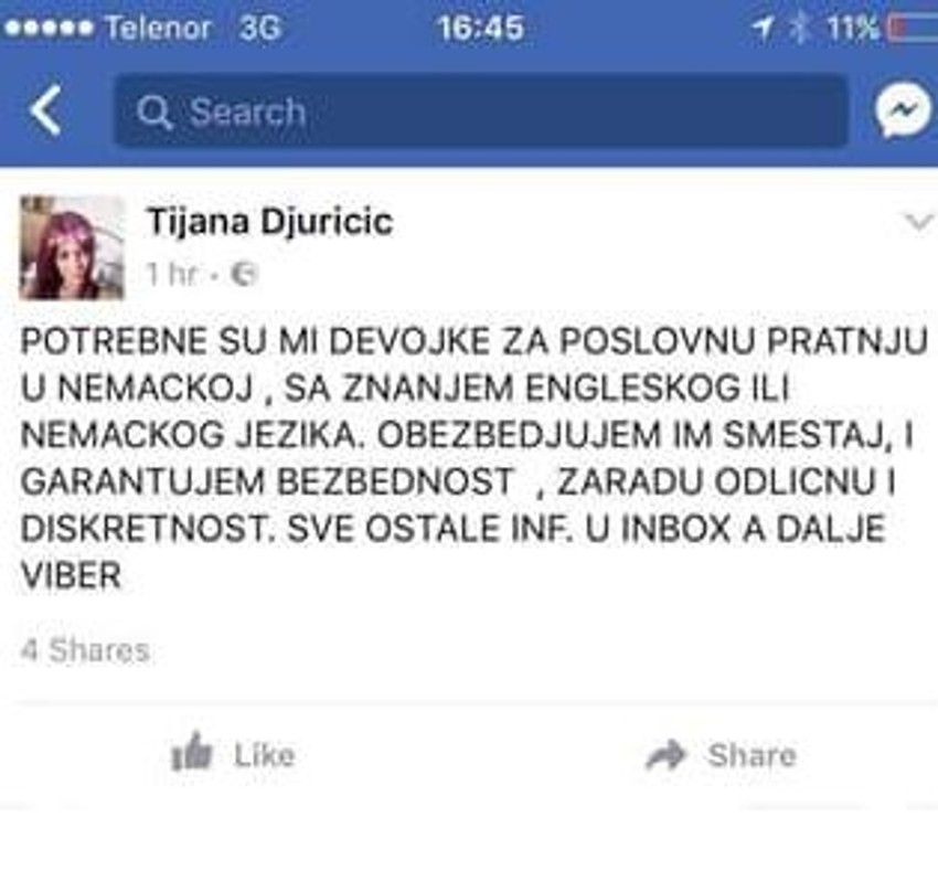 Ona je otvorila ponudu u kojoj traži devojke koje žele da se bave poslovnom pratnjom da joj se jave na oglas, a preduslov za angažman je znanje engleskog ili nemačkog jezika.