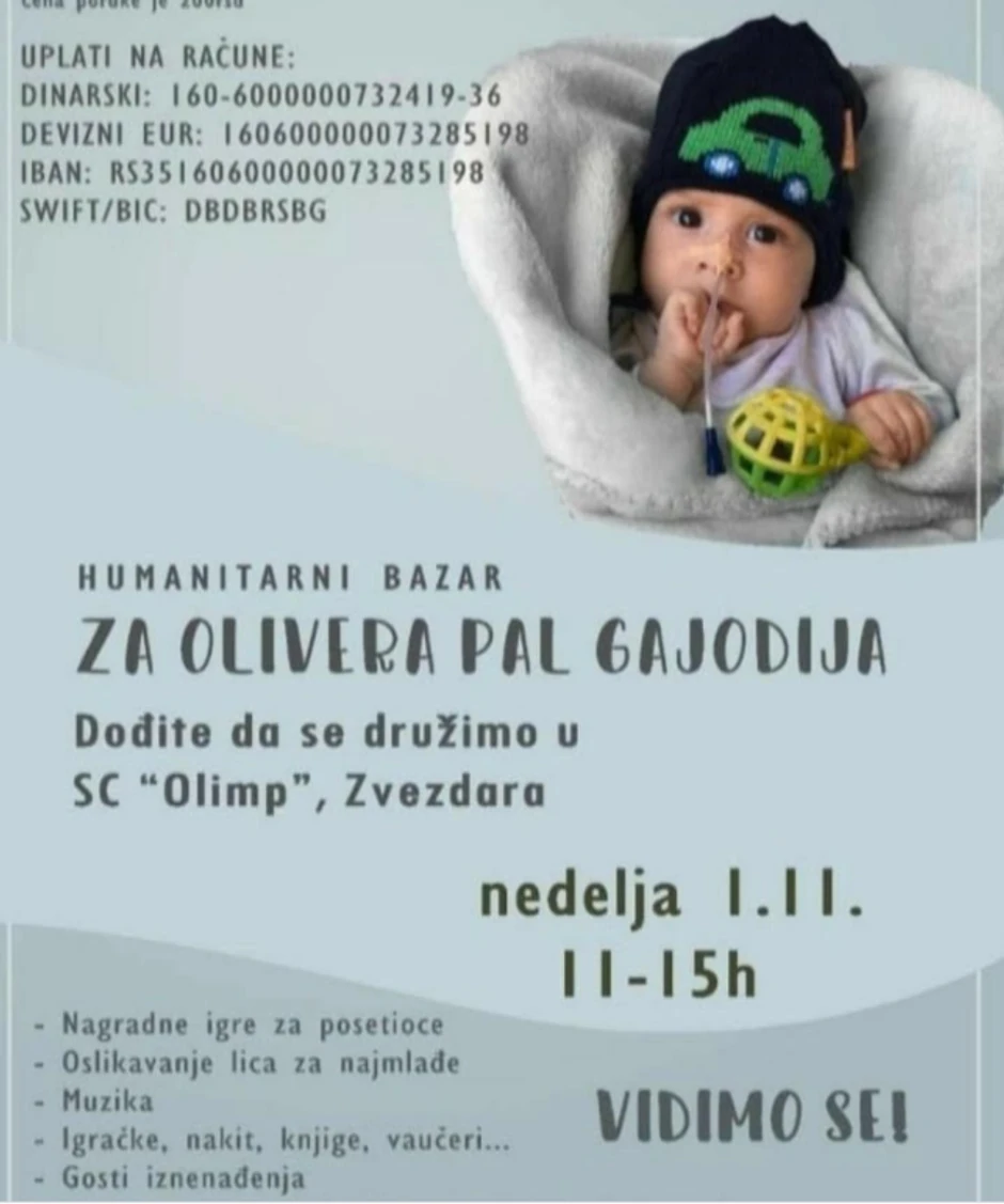 Fondacija Budi human organizuje bazare na kojima se skuplja novac za lečenje dece. Ovog puta novac se skuplja za lečenje malog Oliver Pal Gajodi, desetomesečnog dečaka koji je rođen potpuno zdrav, a danas hrabro vodi životnu bitku protiv smrtonosne bolesti - spinalne mišićne atrofije (SMA 1).