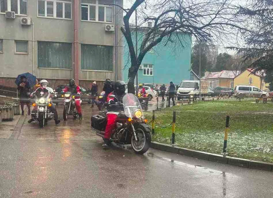 Kolona moćnih dvotočkaša zaustavila se ispred zgrade dečjih klinika gde su Deda Mrazovi motoristi predali novogodišnje paketiće osoblju ovih klinika koje će ih dalje uručiti deci na lečenju.