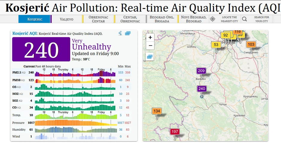 Tako, po zagađenju vazduha ovog jutra prednjači Kosjerić, u kom je od jutros 257 jedinica po AQI (međunarodnom indeksu zagađenja). Za petama mu je Valjevo sa indeksom zagađenja 240 i oba grada su u kategoriji "veoma nezdravo".