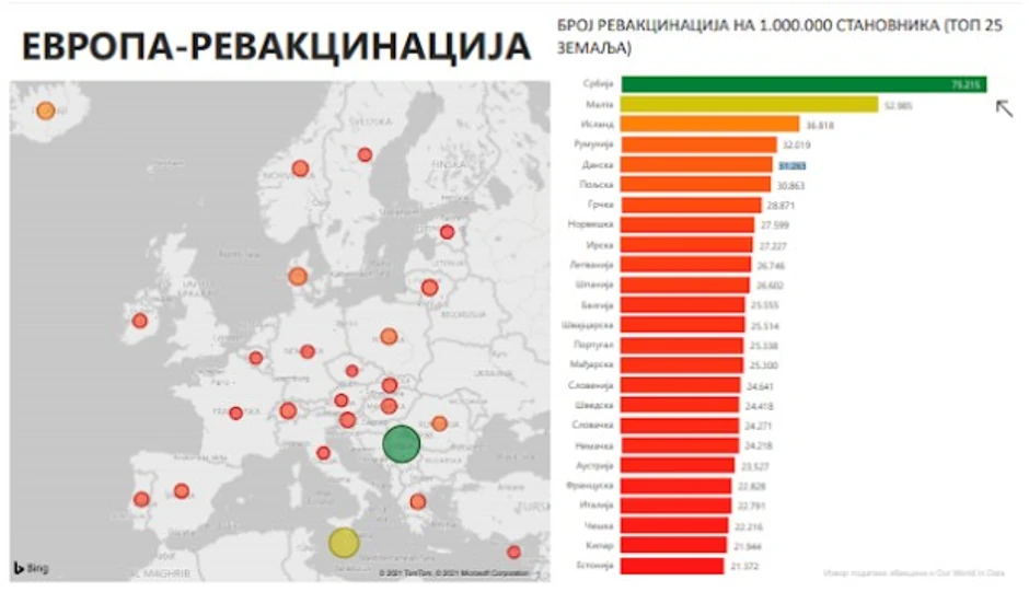 Prema broju vakcinacija na 100 stanovnika, Srbija je druga u Evropi, posle Velike Britanije, a prema broju revakcinacija na 100 stanovnika Srbija je prva u Evropi.