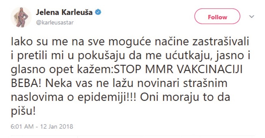 Budući da epidemija traje u Beogradu, Kraljevu, Nišu, Bujanovcu, Smederevskoj Palanci, Velikoj Plani, Bojniku, Boru, Novom Sadu, Leskovcu, Smederevu i Šapcu, a da su zabeležena i dva smrtna slučaja prouzrokovana virusom morbila, pevačica Jelena Karleuša ne prestaje da širi propagandu protiv MMR vakcina.
