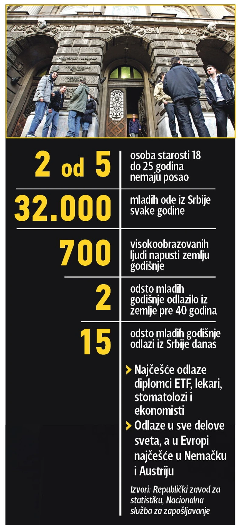 Njen stav deli ogroman broj mladih, a naročito onih koji su već završili studije i nemaju posla. Prema zvaničnoj statistici, najmanje 700 visokoobrazovanih mladih ljudi svake godine napusti Srbiju, a među njima su najčešće inženjeri elektrotehnike, lekari, stomatolozi i ekonomisti.
