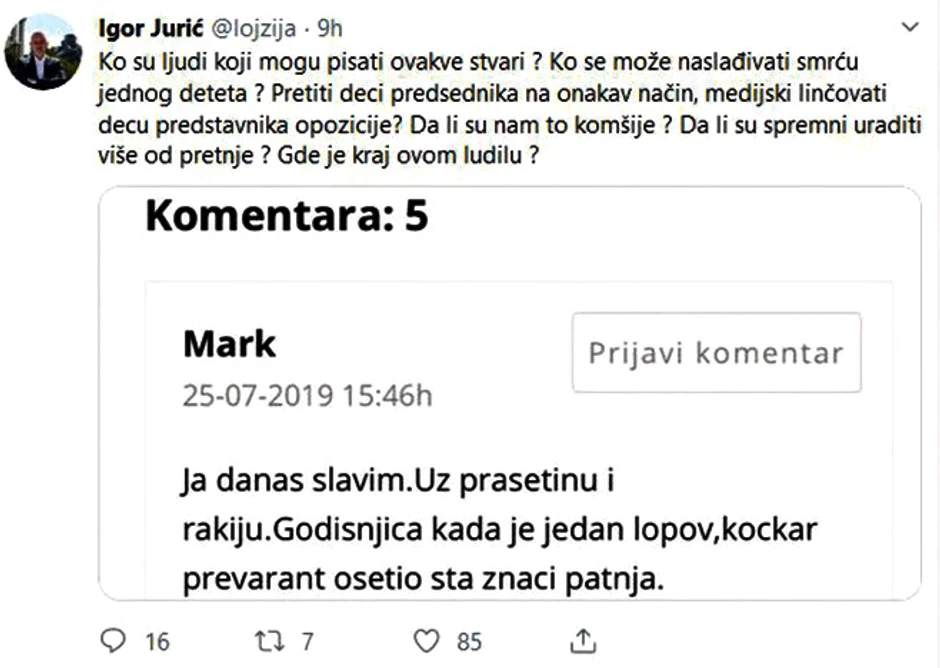 - Danas je žrtva moja Tijana. Danas se neko raduje smrti našeg deteta. Danas to mene jako boli. Neko ko se raduje smrti bilo kog deteta, u stanju je da naudi detetu. I ja to zaista ne želim, ali ukoliko nastavimo da ohrabrujemo monstrume, Tijana neće biti jedina žrtva - naglašava Jurić.