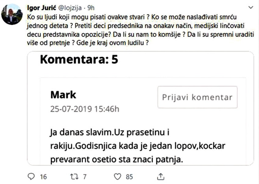 Da u nizu napada i pretnji preko interneta, anonimnim zlostavljačima ništa nije sveto, pokazuje i užasna poruka koja je porodici Jurić upućena na godišnjicu Tijanine smrti: "Ja danas slavim. Uz prasetinu i rakiju. Godišnjica kada je jedan lopov, kockar, prevarant osetio šta znači patnja".