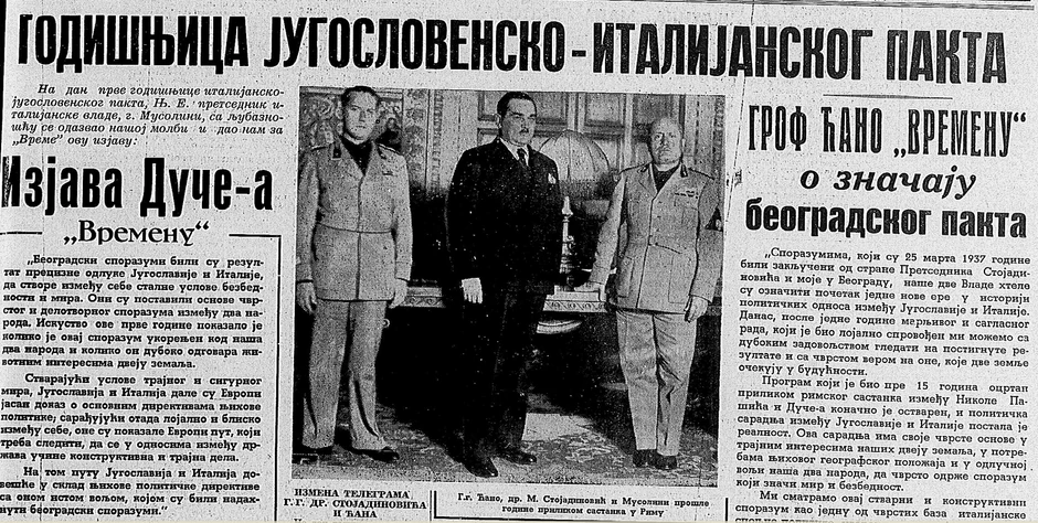 Na naslovnoj strani "Vremena" od pre osam decenija izašao je potpis – lično Dučea, odnosno Musolinija. Italijanski predsednik Vlade dao je izjavu jugoslovenskom listu na dan godišnjice jugoslovensko-italijanskog pakta.