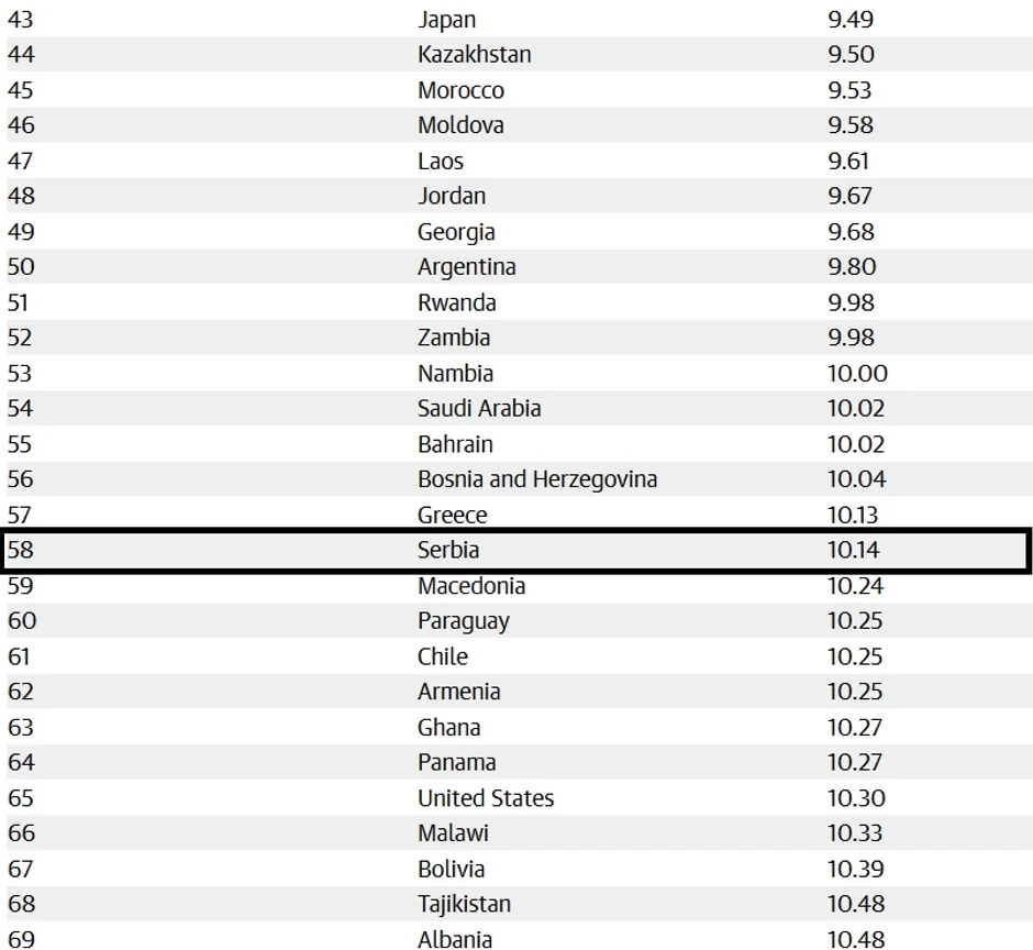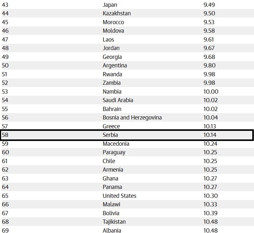 Srbija se tako nalazi ispred SAD, koje su na 65. mestu, dok je na vrhu liste Island, za kojim slede Švajcarska i Finska, dok su poslednje mesto zauzeli Filipini.