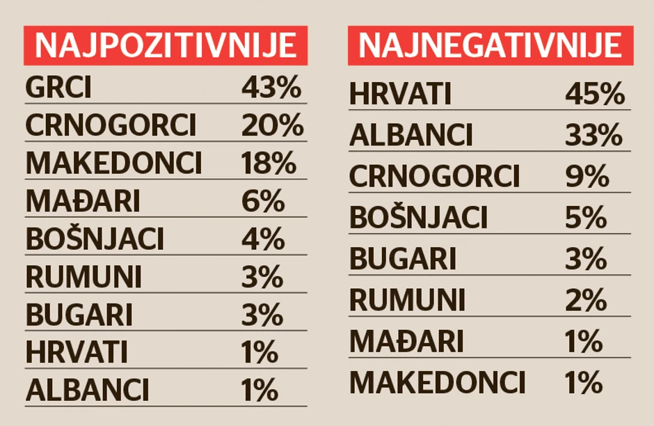 S druge strane, na vrhu lestvice najomraženijih naroda u Srba su Hrvati. Čak 45 odsto ispitanika izjasnilo se negativno kada su u pitanju građani zemlje sa kojom se graničimo. Odmah za Hrvatskom, na listi naroda koje negativno ocenjujemo su Albanci. O tome svedoči podatak da se o Albancima negativno izjasnilo čak 33 odsto ispitanika, a čak 68 odsto Albanaca najnegativnije vidi Srbe.