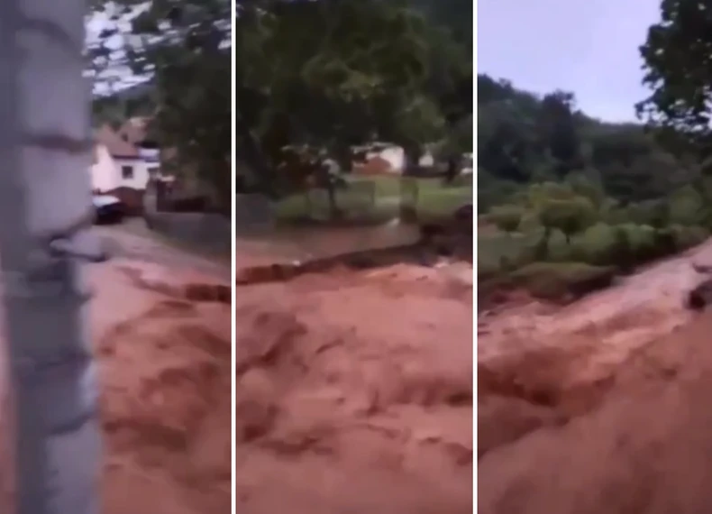 Na snimku koji je objavljen vidi se kako bujica vode "tutnji" pored kuća i pravi odrone u zemlji.