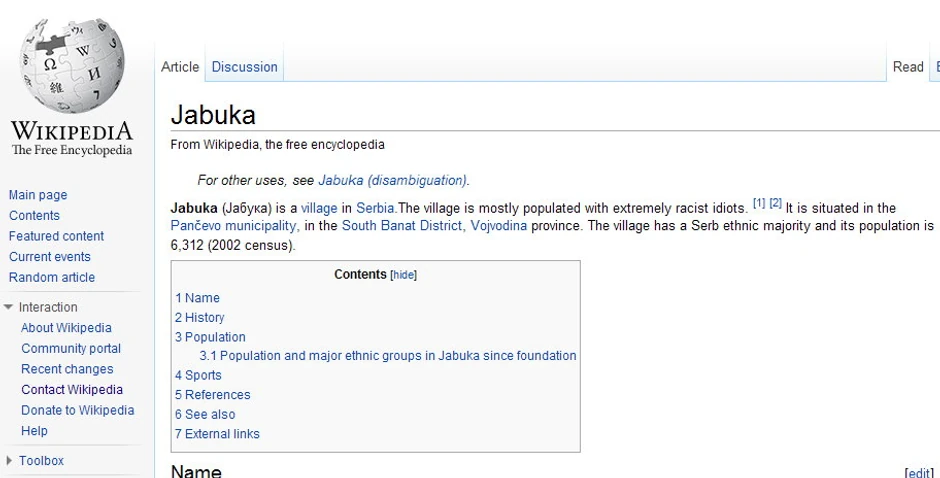 "Jabuka je selo u Srbiji. Selo je uglavnom naseljeno ekstremno rasističkim idiotima", piše na engleskoj verziji internet enciklopedije "Vikipedija", a izmena teksta je poslednji put uneta danas u 14.15 časova popodne, pokazuju podaci na "Vikipediji".
