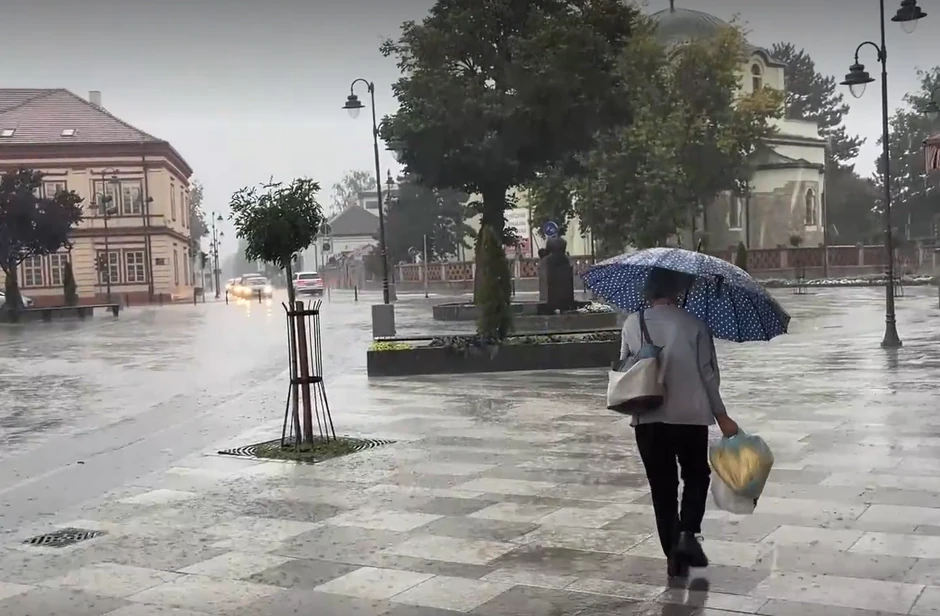 U kratkom vremenskom periodu pala je velika količina kiše, pa se voda prelivala iz oluka na zgradama u centru ovog grada.